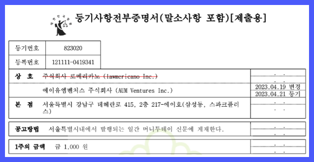 [정관과 등기가 함께 바뀌는 사항 예시]