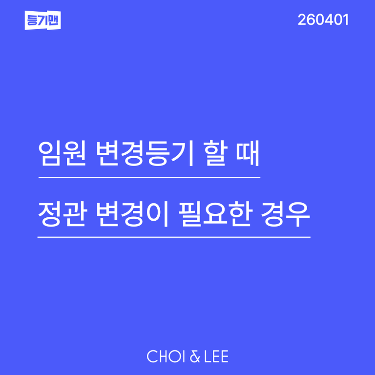 결국 임원 변경등기는 원칙적으로 정관변경을 수반하지 않는 등기입니다. 다만 몇몇 쟁점에서는 정관 변경 필요 여부를 반드시 확인해야 하고, 그보다 더 중요한 것은 임원 관련 규정이 정관에 어떻게 들어가 있는지를 먼저 보는 것입니다. 임원 변경등기는 사람만 바꾸는 절차처럼 보이지만, 실제로는 정관을 가장 꼼꼼히 봐야 하는 등기 중 하나입니다.