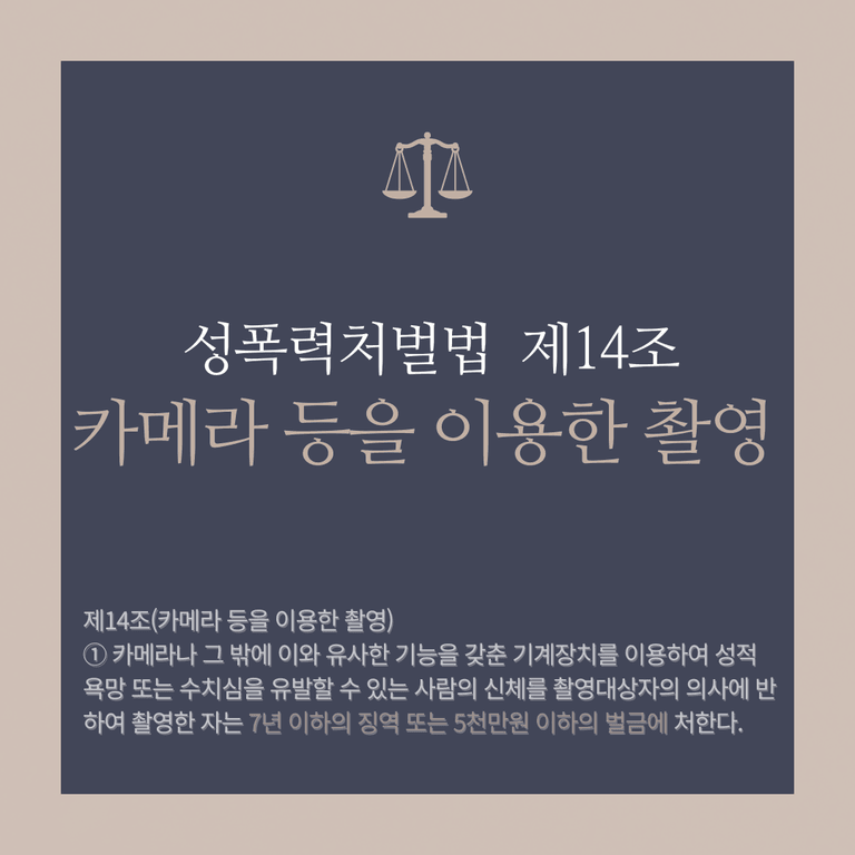 ① 카메라나 그 밖에 이와 유사한 기능을 갖춘 기계장치를 이용하여 성적 욕망 또는 수치심을 유발할 수 있는 사람의 신체를 촬영대상자의 의사에 반하여 촬영한 자는 7년 이하의 징역 또는 5천만원 이하의 벌금에 처한다.