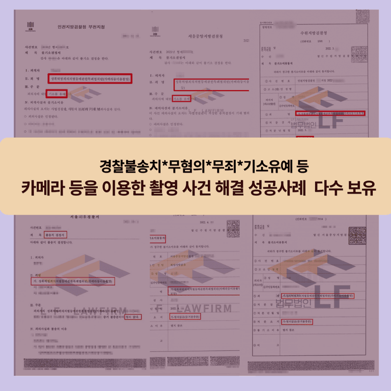 카메라등이용촬영죄 사건에서 경찰 불송치 및 무혐의 처분을 이끌어낸 다수의 사례는 물론, 개별적인 상황과 입장에 따라 기소유예 처분을 도출해 낸 경험과 더불어, 무혐의 입증이 쉽지 않은 상황에서도 무죄 결과를 받아낸 성공사례 역시 풍부하게 보유하고 있습니다.