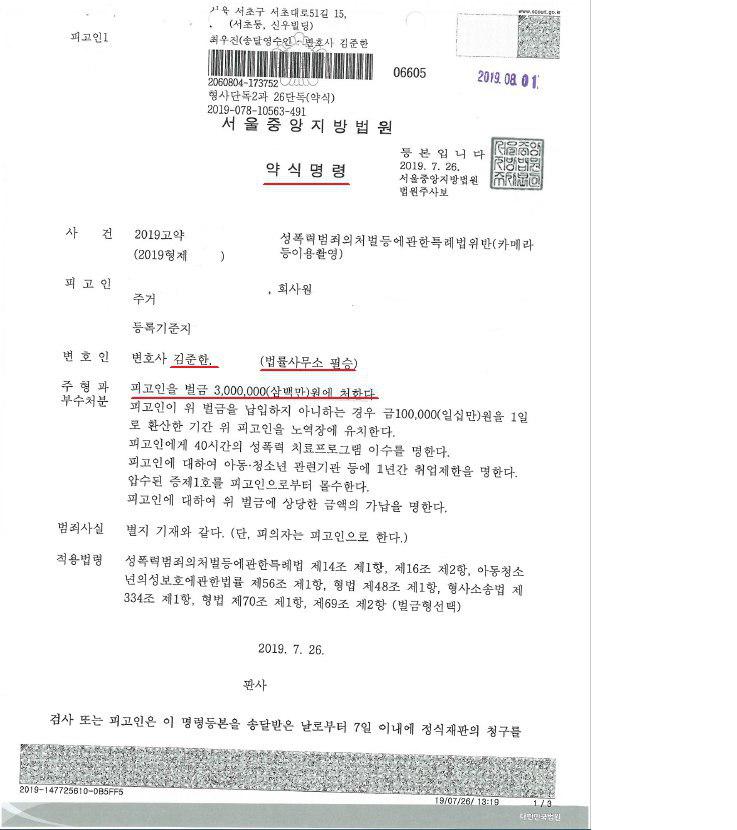 총 5명의 피해 여성을 촬영하였고, 동일한 카메라등이용촬영죄 처벌 전력이 있는 의뢰인님은 실형이 선고될 수 있는 매우 위험한 상황에 있었습니다. 그러나 안내해드린 양형자료들과 선처를 호소하는 변호인의견서 및 재판 진행을 통해 서울중앙지방검찰청은 재판없이 약식기소하였고 서울중앙지방법원 역시 약식기소에 따라 의뢰인님을 벌금에 처한다는 약식명령을 하였습니다.