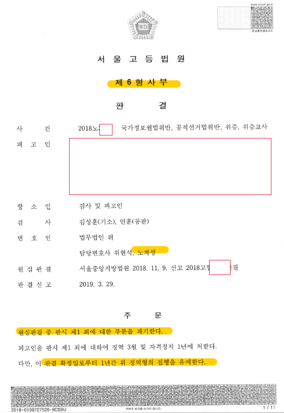 국가정보원법위반·공직선거법위반(댓글공작·위증) → 결과 : ‘항소심 감형 및 석방’