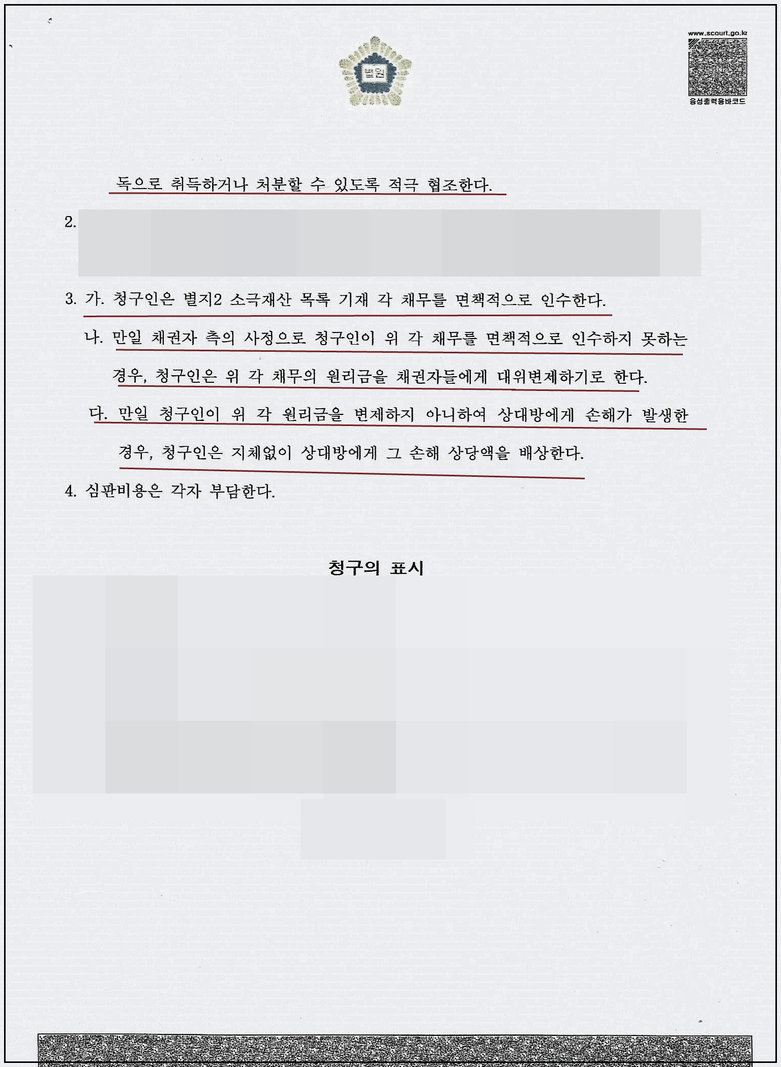 아래 사례는 적극적 상속재산을 가지는 공동상속인 중 1인이 가분적 상속채무까지 면책적으로 인수 하되, 만일 인수인이 변제하지 못하는 경우 상대방에게 손해를 배상하도록 하는 내용을 화해권고결정주문에 직접 기재하는 방식으로 가분적 상속채무에 대해 적극적으로 분할한 사건입니다.