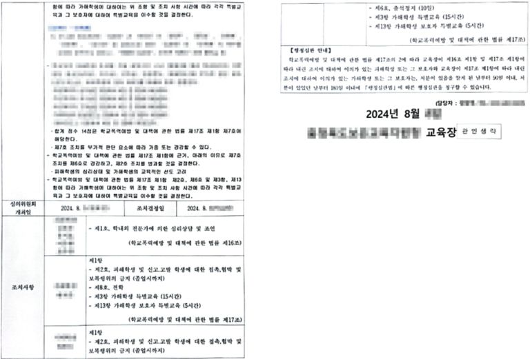 학교폭력 신고를 하여 가해자중 한명은 중학생을 대상으로 한 처분 중 최고 처분인 전학처분, 한명인 출석금지10일등의 처분을 받은 사건입니다.