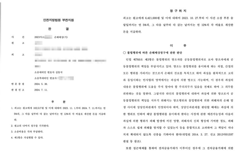 보이스피싱 통장대여로 민사소송이 들어온 상태이지만 의뢰인 본인이 받은 돈 10만 원 빼고 전부 기각시킨 사례입니다.