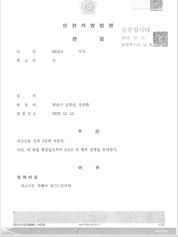 최근 법원은 재산 범죄의 경우 피해자와 합의가 되지 않거나 피해금액이 전혀 변제되지 않을 경우, 실질적으로 대다수의 피고인에게 실형이 선고되고 구속이 되는 상황임에도 불구하고 변호인의 차분하고 정리된 변론으로 집행유예의 선고를 이끌어 낸 사안입니다.