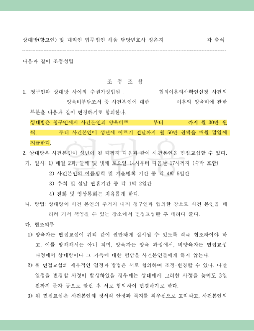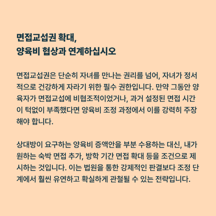 상대방이 요구하는 양육비 증액안을 일정 부분 수용해주는 대신, 내가 원하는 숙박 면접 추가, 방학 기간 면접 확대 등을 조건으로 제시하는 것입니다. 이는 법원을 통한 강제적인 판결보다 조정 단계에서 훨씬 유연하고 확실하게 관철될 수 있는 전략입니다.