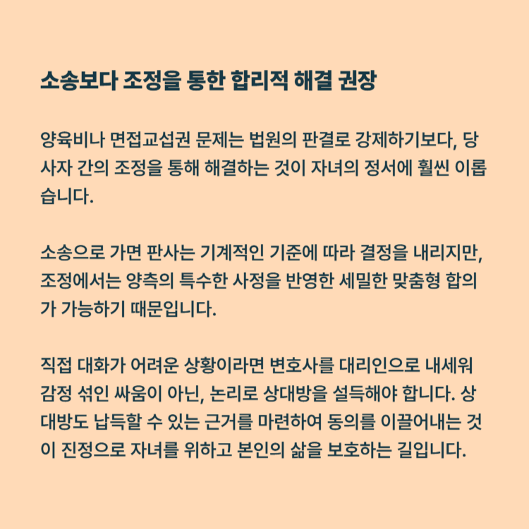양육비나 면접교섭권 문제는 법원의 판결로 강제하기보다, 당사자 간의 조정을 통해 해결하는 것이 자녀의 정서에 훨씬 이롭습니다. 소송으로 가면 판사는 기계적인 기준에 따라 결정을 내리지만, 조정에서는 양측의 특수한 사정을 반영한 세밀한 맞춤형 합의가 가능하기 때문입니다.