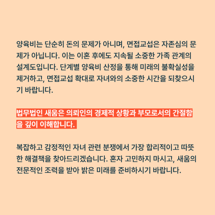 양육비는 단순히 돈의 문제가 아니며, 면접교섭은 자존심의 문제가 아닙니다. 이는 이혼 후에도 지속될 소중한 가족 관계의 설계도입니다. 단계별 양육비 산정을 통해 미래의 불확실성을 제거하고, 면접교섭 확대로 자녀와의 소중한 시간을 되찾으시기 바랍니다.