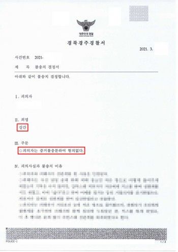 경북경주경찰서는 이 사건에 대해 다음과 같은 사유로 불송치 결정 처분을 하였습니다.