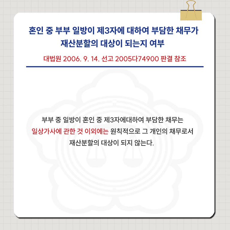 1️⃣ 이혼 시 배우자 일방의 채무 — '각자 책임' 원칙