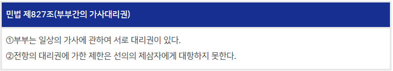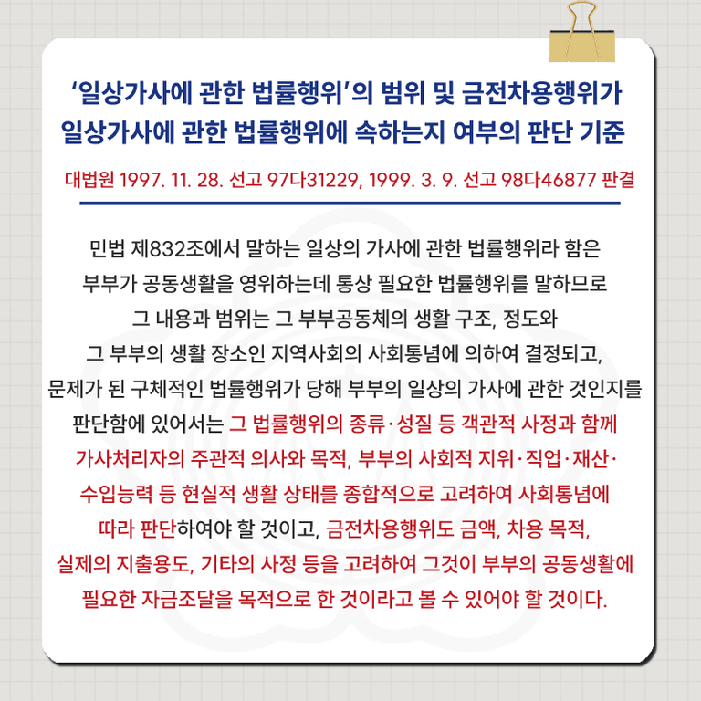 ✅ 부부 중 일방 명의의 아파트 구입비용 명목으로 차용한 경우 필수적인 주거 공간을 마련하기 위한 것이라면 일상의 가사에 속한다고 볼 수 있습니다.