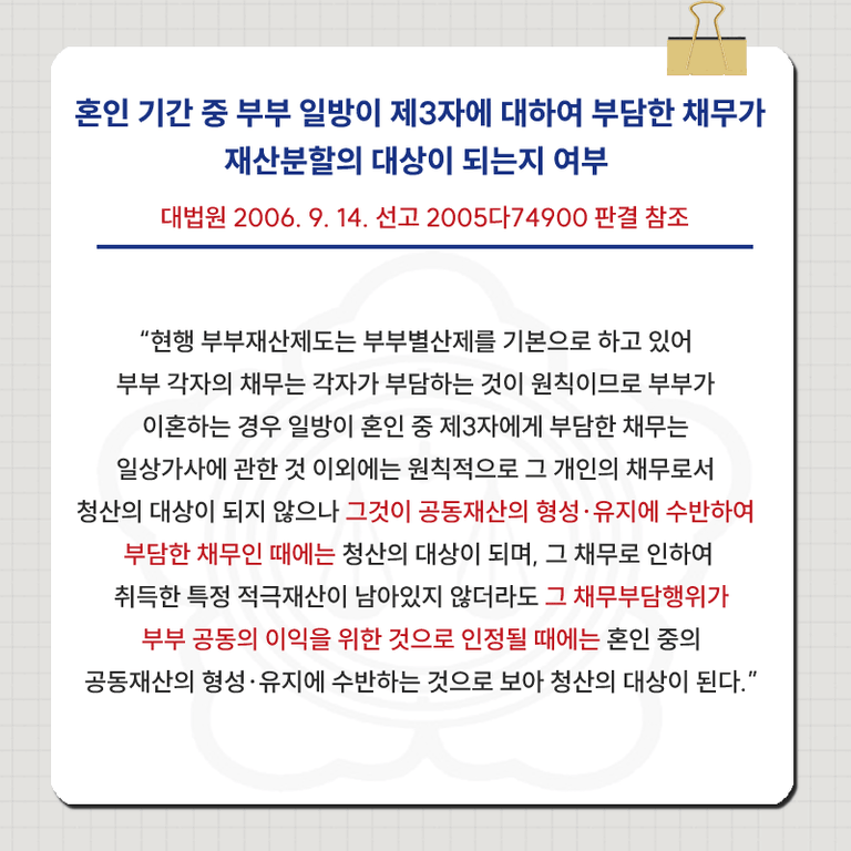 ☑️ 채무의 성격: 그 빚이 일상가사와 관련된 채무인가? 또는 공동재산 형성에 기여했는가? 일상가사에 수반한 채무였거나 공동재산 증식을 위해서 수반된 것이었다면, 소극재산으로 반영됩니다.