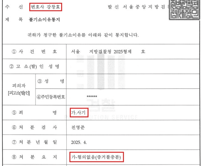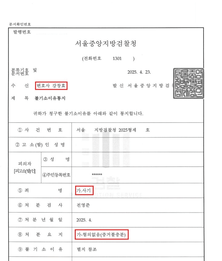 그 결과 경찰에서 일부 송치되었던 부분까지 포함하여 전부 불기소(혐의없음, 증거불충분) 처분이 내려졌습니다.