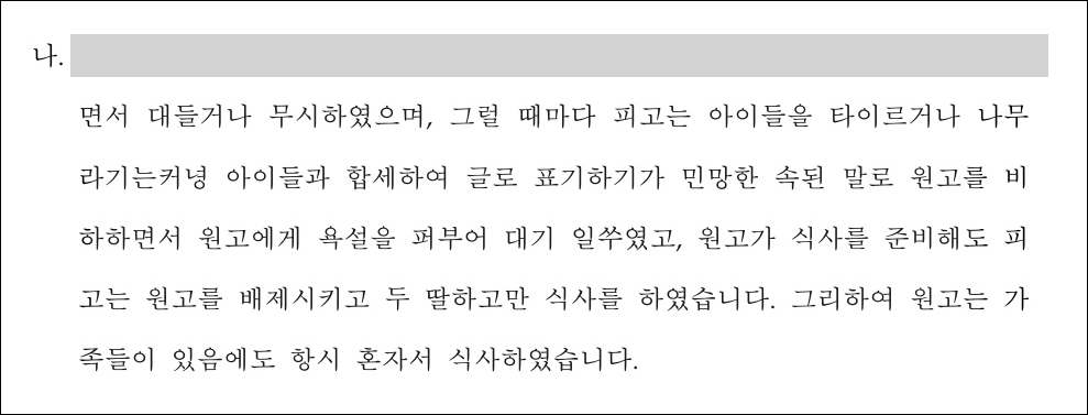 실제 원고가 제출한 소장에는, 의뢰인이 배우자를 지속적으로 무시하고 부당하게 대우하였으며 그로 인해 혼인 관계가 파탄에 이르렀다는 취지의 주장이 기재되어 있었고, 이를 근거로 의뢰인을 이른바 ‘유책 배우자’로 특정하고 있었습니다.