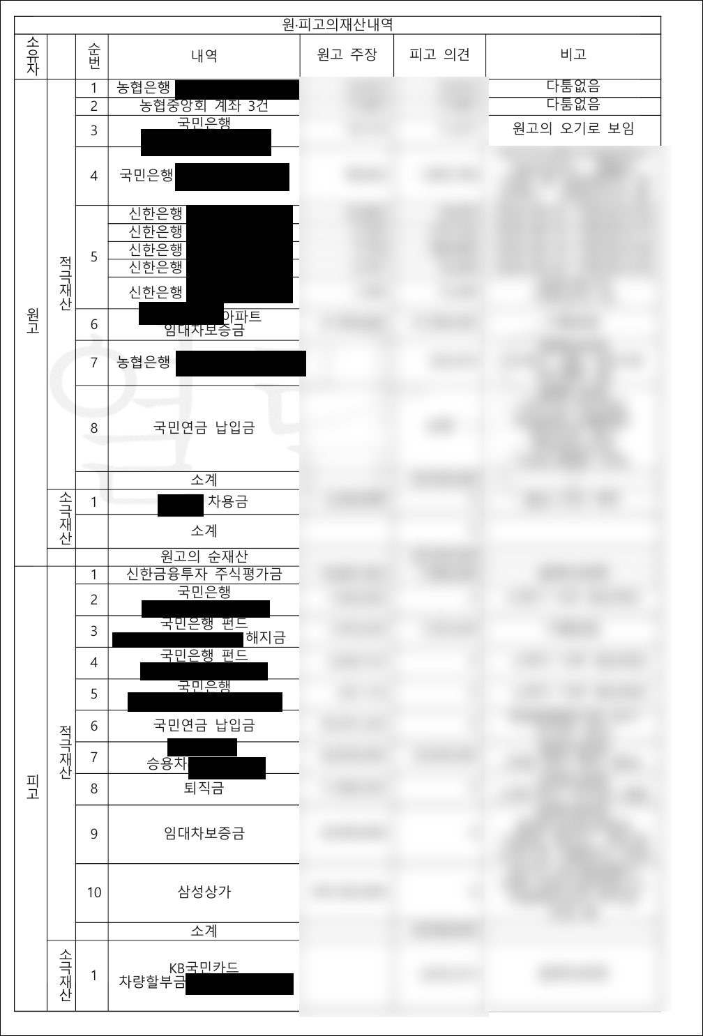 (본 사건에 실제 제출된 재산분할 정리 내역 [표]입니다)