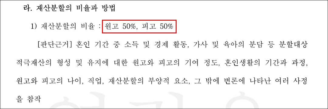법원은 피고 역시 혼인 기간 동안 재산 형성 및 유지에 실질적으로 기여한 점을 인정하여 재산분할 비율을 5:5로 산정하였습니다.