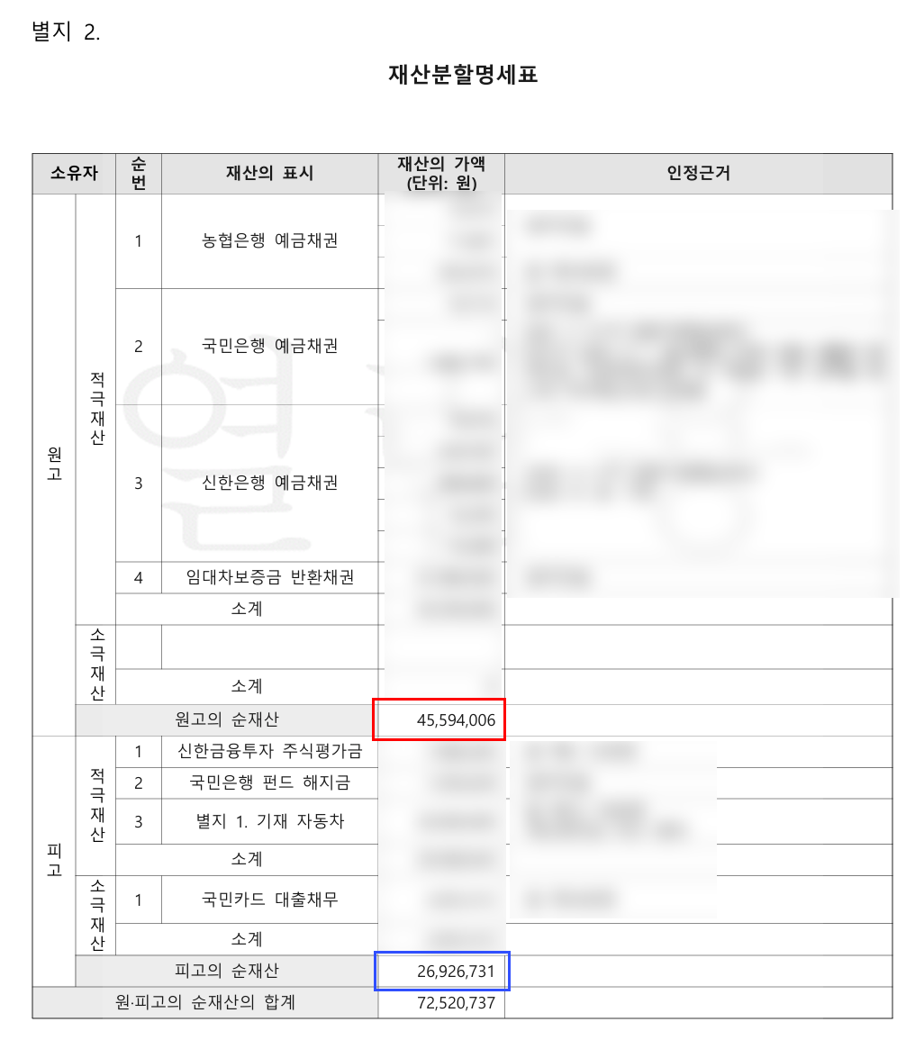 그 결과, 원고의 순재산은 약 4,500만 원, 피고의 순재산은 약 2,600만 원 수준으로 확인되어 원고가 더 많은 재산을 보유하고 있는 것으로 판단되었습니다.
