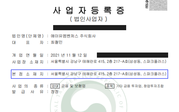 [실제 사업자등록증 상 본점소재지 기재 사례]