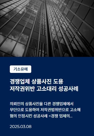 한편 최근 실무 동향을 살펴보면 쇼핑몰 이미지 저작권 침해로 리셀러분들을 상대로 한 대량 고소가 매우 빈번하게 이루어지고 있는 상황입니다. 따라서 억울하게 고소를 당하셨다고 해서 두려움에 휩싸여 상대방이 요구하는 합의금을 서둘러 지급하기보다는, 이 성공사례와 같이 초기 경찰 조사 단계부터 사실관계를 정리하고 법리적으로 차분히 대응하는 것이 무엇보다 중요합니다.