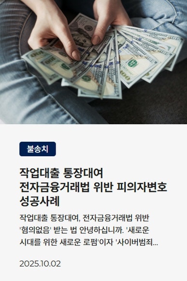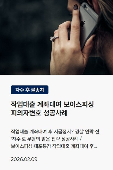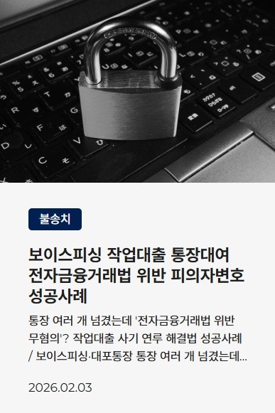 ![[보이스피싱]대포통장 명의자 처벌위기,무혐의 대응 전략#대포통장](/_next/image?url=https%3A%2F%2Fd2ai3ajp99ywjy.cloudfront.net%2Fuploads%2Ftitleimage%2Foriginal%2F5c6e24c5bb38fe09bee65333-original.jpg&w=3840&q=75)