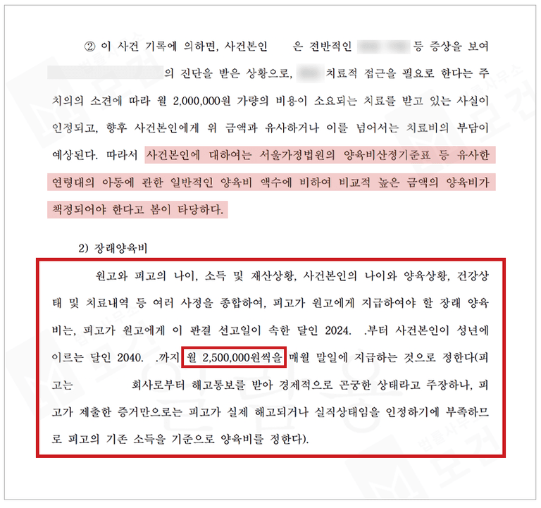 그런데 의뢰인의 자녀의 경우, 병원에서 지속적으로 치료가 필요하다는 진단을 받았고, 이로 인해 매월 들어가는 치료비도 상당한 수준이었는데요. 이에 저희는 양육비 산정 시 고액의 치료비도 함께 산정해줄 것을 적극적으로 주장하였습니다.