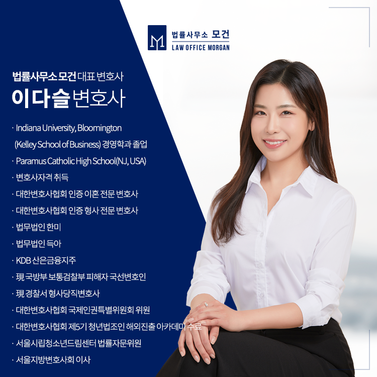 이다슬 변호사는 대한변호사협회등록 이혼전문변호사로서, 다수의 이혼소송을 진행해왔습니다. 의뢰인의 상황에 맞는 좋은 결과를 이끌어내기위해 최선을 다하고 있으니, 도움이 필요하신 분들께서는 법률사무소 모건으로 문의하여 주시기 바랍니다.
