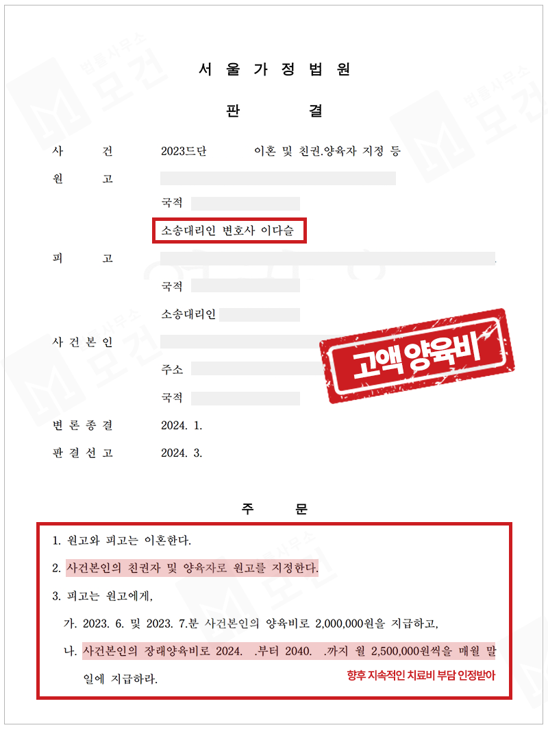 이다슬 변호사의 성공사례 중 자녀의 치료비가 인정되어 월 250만원의 양육비가 인정된 사례를 소개해드립니다.