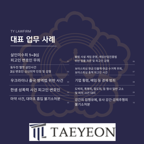살인 사건, 살인미수 사건 뿐만 아니라, 우크라이나 출국 병역법 위반, 보이스피싱 현금 인출책, 보이스피싱 총책, 대마초 흡입 사건, 불법 사설 게임 운영 사건, 도박죄, 폭행죄, 절도죄 등 다양한 형사 사건을 해결하며 수많은 성공 사례를 쌓고 있습니다.