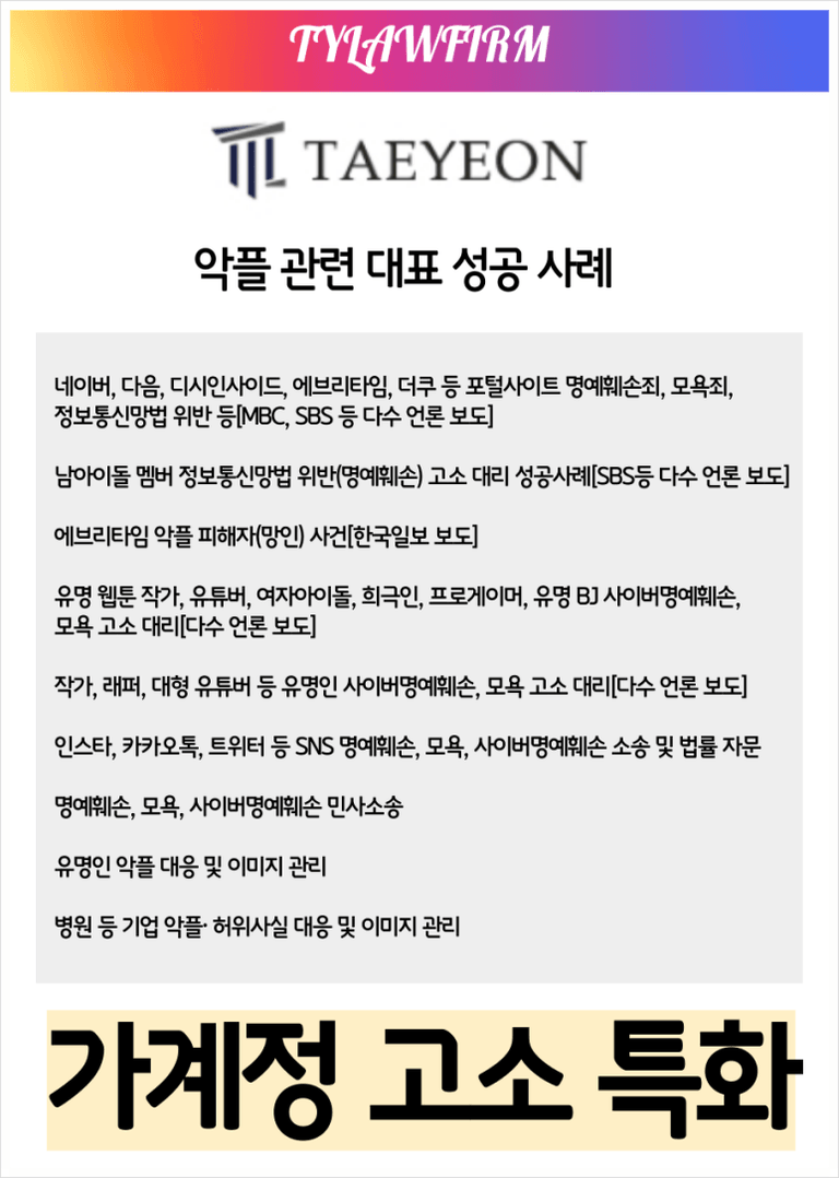 신상 박제나 가계정 악플, 가짜뉴스 피해로 고민 중이시라면 태연법률사무소를 찾아주시기 바랍니다.