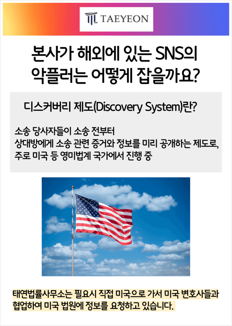 본사가 해외에 있어서 악플러 신상을 특정하기 어려운 경우에는 직접 미국으로 가서 미국 변호사와 협업하여 미국 법원에 정보 제공을 요청하고 있는데요.
