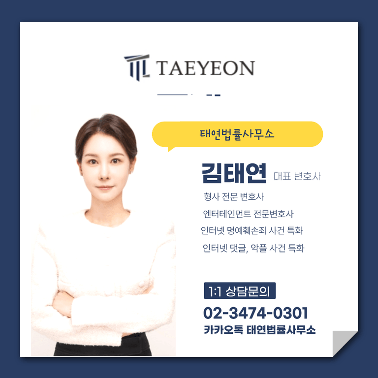 태연법률사무소의 김태연 대표 변호사님은 명예훼손죄 사건 특화 형사 전문 변호사이자 엔터테인먼트 전문 변호사입니다. 악플과 비방에 노출되기 쉬운 아이돌, 배우, 인기 유튜버 및 BJ 등 수많은 유명인의 사건을 전담하며 쌓아온 노하우를 바탕으로, 일반인 의뢰인의 사건까지 차원이 다른 법률 서비스를 제공합니다.