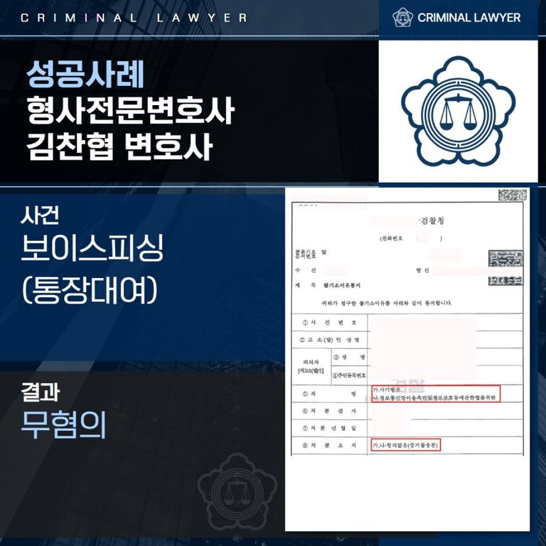 보이스피싱 통장대여 → 결과 : ‘무혐의’ 처분 종결