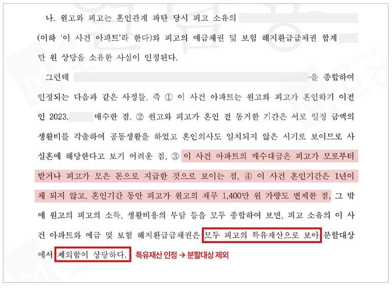즉 저희 의뢰인이 본인 명의의 아파트와 예금채권 등을 지킬 수 있었던 것은, 원고가 피고 명의의 특유재산의 유지에 협럭하여 감소를 방지한 사실, 그 증식에 협력한 사실이 없음을 입증해냈기 때문인데요.