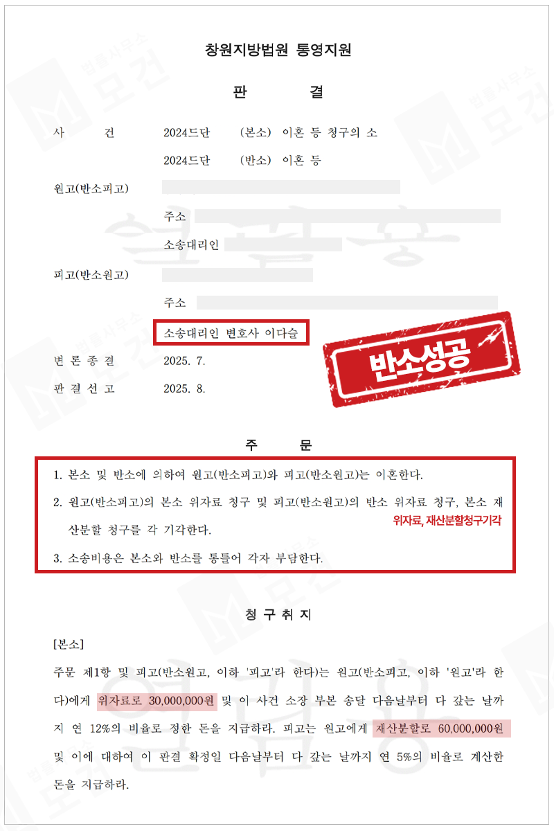 피고는 목동이혼소송전문변호사인 이다슬 대표 변호사의 도움을 받으시게 되었고, 저희는 소송 방어를 위해 이혼 및 위자료를 청구하는 '반소'를 제기하였습니다.