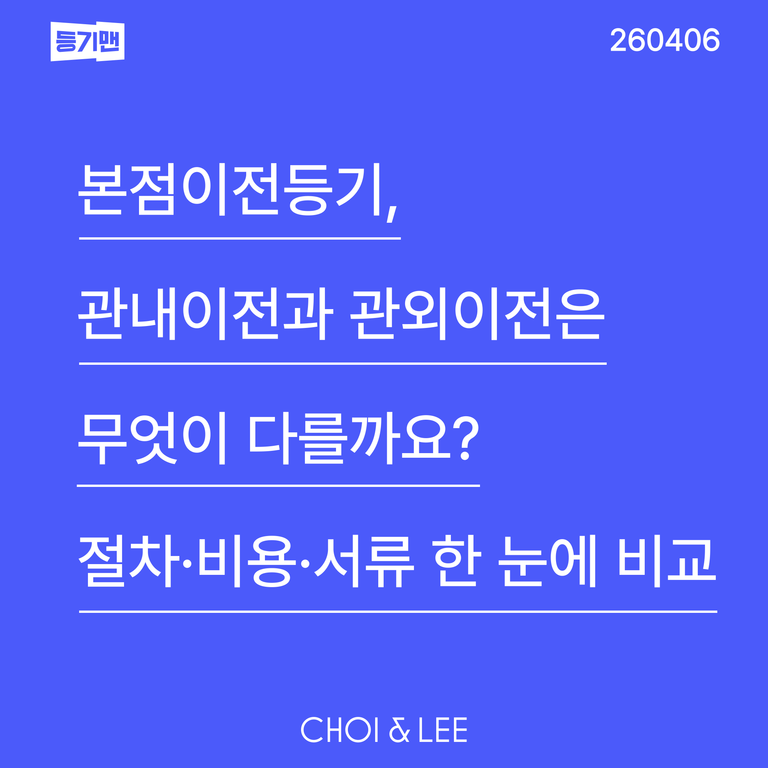 본점이전 등기에서 가장 중요한 것은 이전 후 주소를 보는 것이 아니라, 먼저 이번 이동이 관내인지 관외인지 정확히 분류하는 것입니다. 이 첫 단추만 맞추면 절차와 비용, 서류는 훨씬 쉽게 정리됩니다.
