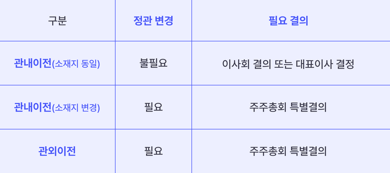 1) 관내이전: 대표이사 결정 또는 이사회 결의로 처리