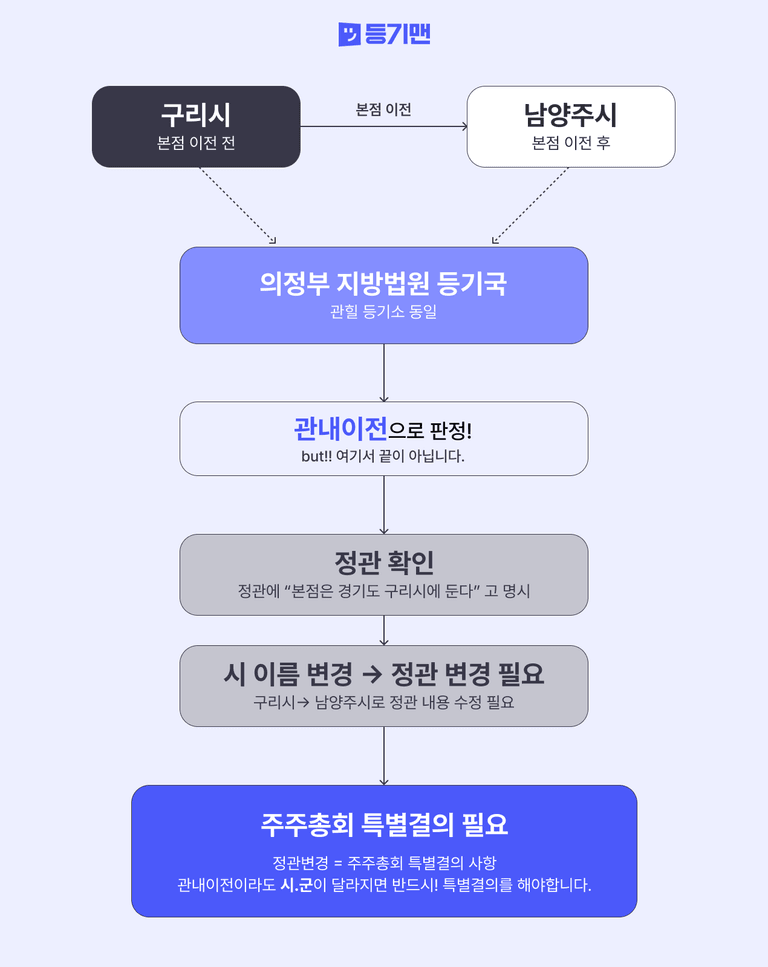 법인등기에 어느정도 익숙한 분도 이 부분을 놓치는 경우가 많습니다. 앞서 살펴본 구리시 → 남양주시 이전 사례처럼, 본점소재지는 달라지지만 관할 등기소는 동일한 경우에는 등기소가 동일하기 때문에 관내이전에 해당합니다.