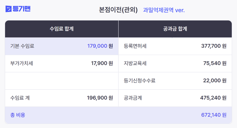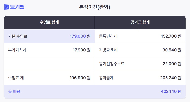 과밀억제권역 이슈가 없는 일반적인 경우, 관내이전은 약 142,000원, 관외이전은 약 177,000원 수준입니다. 단, 과밀억제권역으로 이전하는 경우 등록면허세 중과로 비용이 크게 달라질 수 있습니다.
