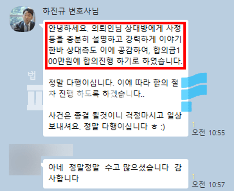 합의 초반 저작권자 측에서 높은 합의금액을 요구해왔으나, 다양한 토렌트 합의 진행 노하우를 바탕으로 최종 합의금 100만원으로 합의를 이끌어냈습니다.