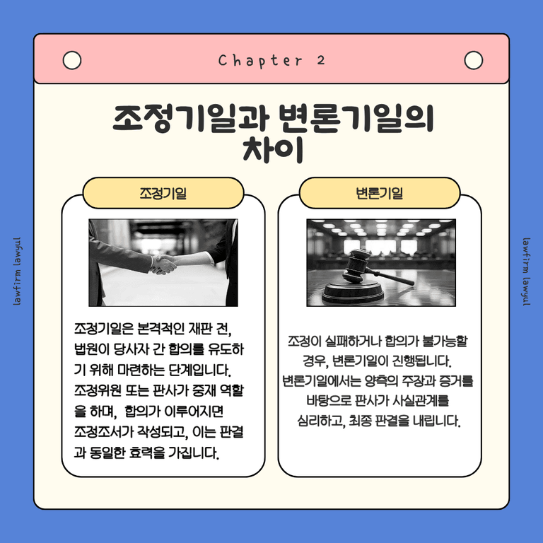 즉, 조정기일은 화해의 기회, 변론기일은 법적 판단의 과정이라고 이해하면 됩니다.