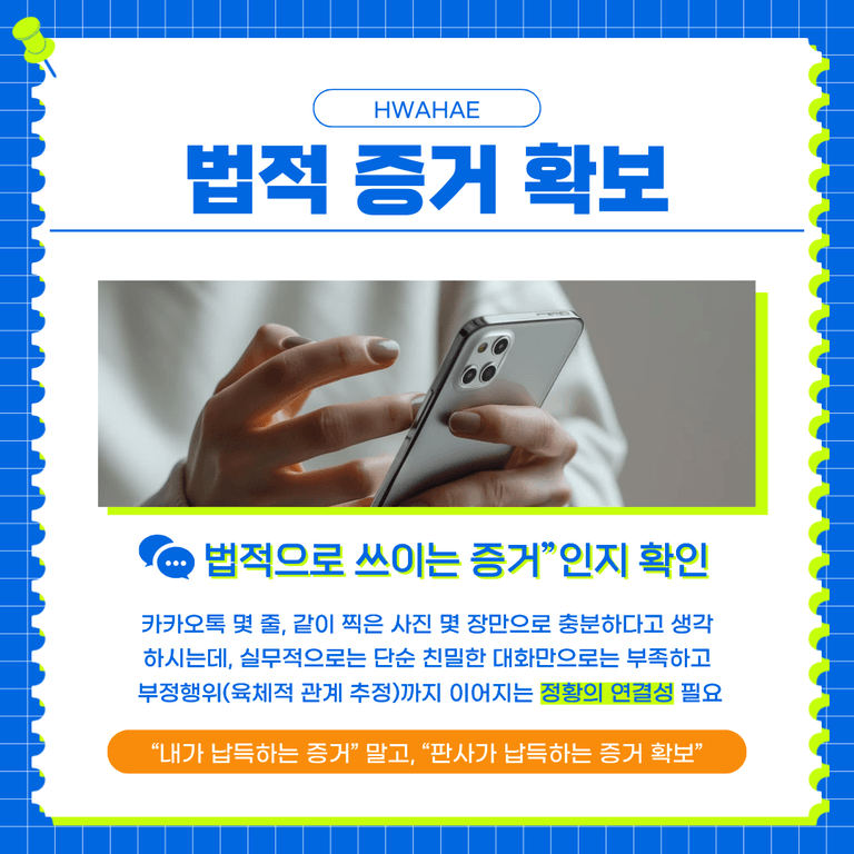 재판부가 핵심으로 다루는 것은 결국 '정황의 연결성'입니다. 사진 몇 장, 카톡 몇 개 수준의 자료가 아니라, 반복적인 만남의 패턴, 시간대, 장소, 행동이 서로 맞물리면서 '정황상 명백한 외도'임을 입증해야 합니다. 예를 들어 특정 시간대에 지속적으로 만나고, 그 전후의 대화 내용이 자연스럽게 이어진다면 비로소 설득력이 생깁니다. 내가 확신하느냐가 아니라, 제3자가 봤을 때도 자연스럽게 납득되는 흐름인지를 기준으로 증거를 수집하고 판단하셔야 합니다.