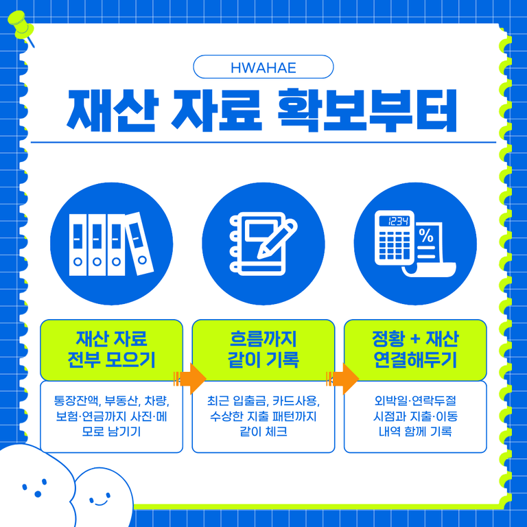 따라서 이혼 절차가 시작되기 전에, 먼저 재산 관련 자료부터 챙겨야 합니다. 배우자 명의의 부동산, 자동차, 금융계좌, 보험, 퇴직연금 등 파악할 수 있는 것들은 미리 메모하거나 사진으로 남겨두세요. 이혼 소송이 시작되고 나면 재산을 숨기거나 처분하는 경우가 실제로 발생하고, 그때부터는 추적이 매우 어려워집니다. 배우자 명의 통장 잔액이 얼마였는지, 어떤 주식이나 펀드를 보유하고 있었는지 기억해두는 것만으로도 나중에 큰 도움이 됩니다.