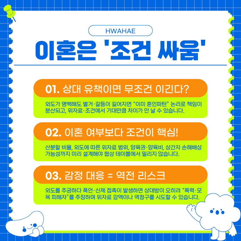 그런데 실무적으로 보면, 바로 이 시점에서의 선택이 이후 결과를 거의 좌우합니다. 같은 상황에서도 누군가는 위자료를 제대로 인정받고 유리한 조건으로 정리하는 반면, 누군가는 분명 상대방 잘못이 있음에도 불구하고 별다른 성과 없이 끝나는 경우가 적지 않습니다. 그 차이는 감정이 아니라, 초기 대응의 방향과 순서에서 크게 갈립니다.