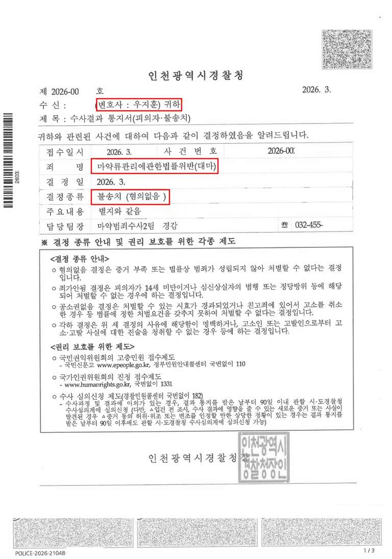 수사기관은 변호인의 주장을 받아들여 무혐의 처분을 내렸습니다.