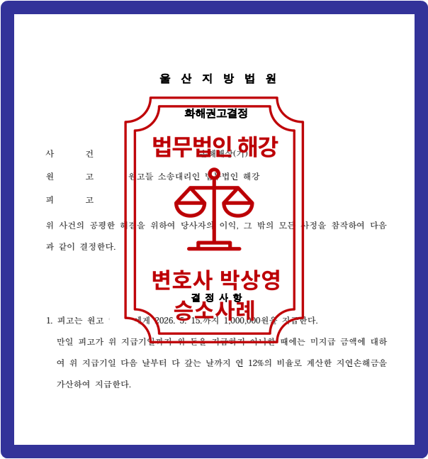 현명한 대처와 전문성을 갖춘 법무법인 해강의 조력으로 저희 법무법인 해강은 의뢰인의 재산보호를 지키고자 하였고 이에 [손해배상 성공]하였습니다.