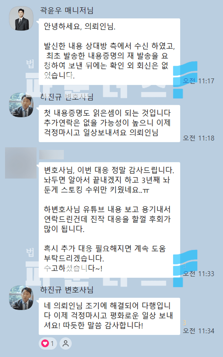 내용증명 발송 이후 A씨의 추가 스토킹 행위가 완전히 중단되어 사건을 마무리 지을 수 있었습니다.