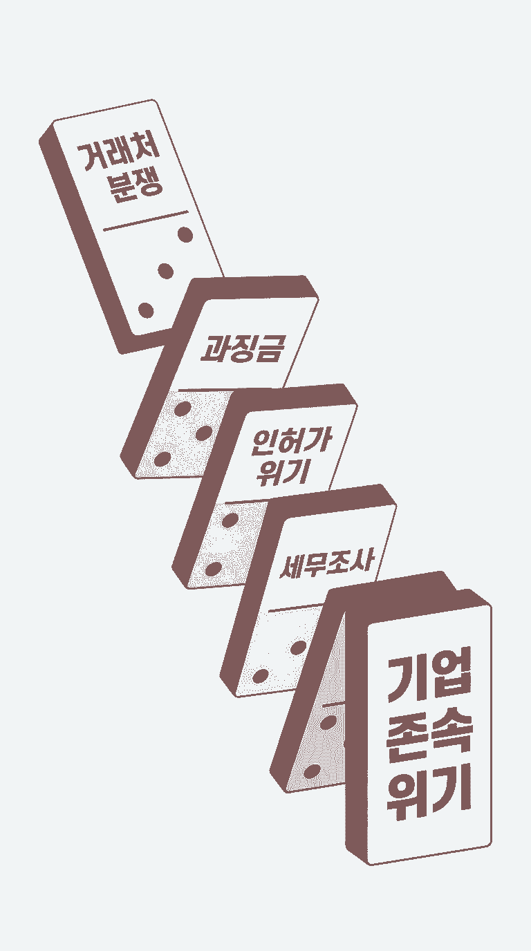 그러나 문제는 거기서 멈추지 않았습니다. 거래처 분쟁이 관계기관에 알려지면서 과징금 부과 통보가 날아왔고, 뒤이어 사업의 근간인 인허가에 대한 행정처분 경고까지 이어졌습니다.