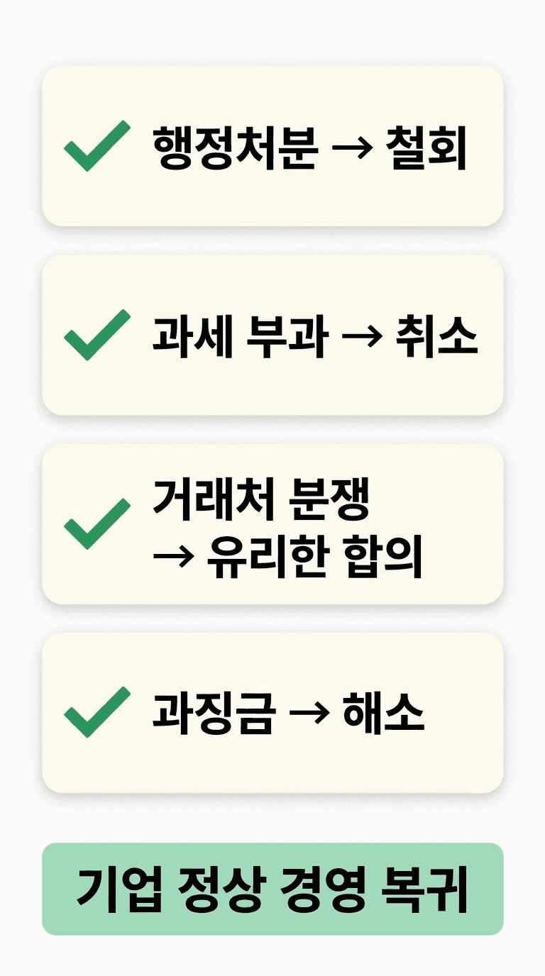 결론부터 말씀드리면, 승소했습니다. 행정기관의 인허가 관련 처분은 철회되었고, 과세관청의 추가 과세는 취소되었습니다. 거래처와의 분쟁 역시 의뢰인에게 유리한 조건으로 마무리되었으며, 과징금 문제도 함께 해소되었습니다. 10억 원대의 위기가 전부 걷힌 것입니다.