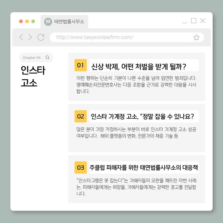 오랜 시간 많은 분들의 신뢰를 얻고 있는 태연법률사무소는, 인스타그램고소 사안에서도 경험을 통해 얻은 노하우를 기반으로 자세하고 전문적인 상담을 진행해 드리고 있습니다.